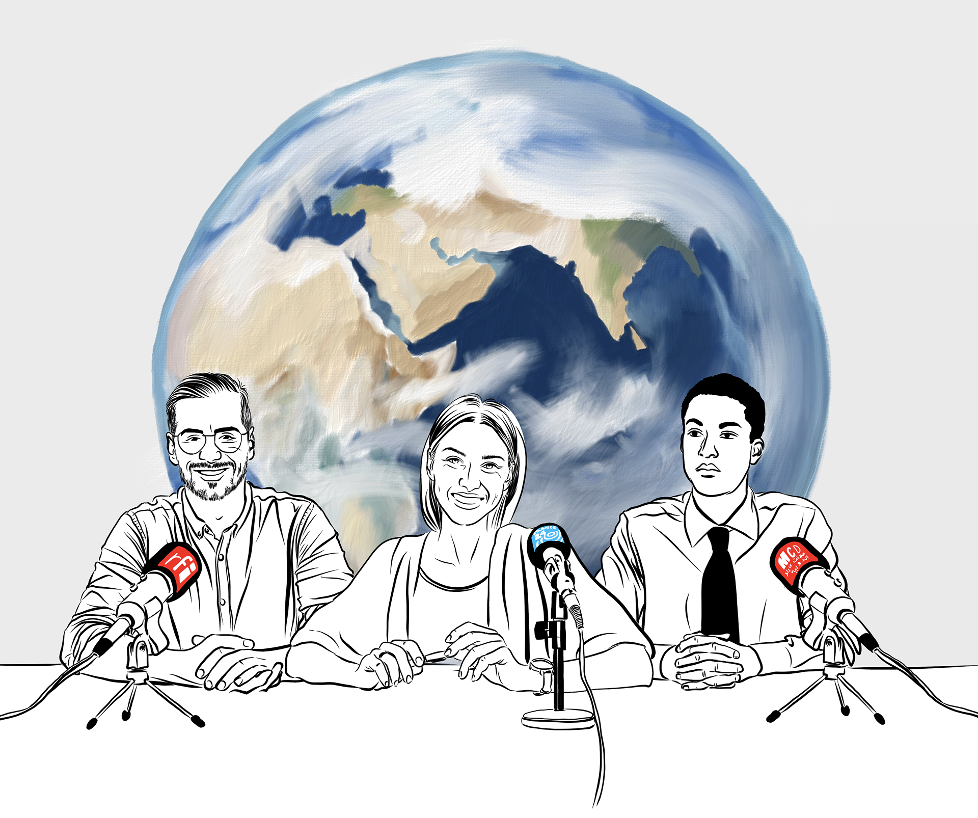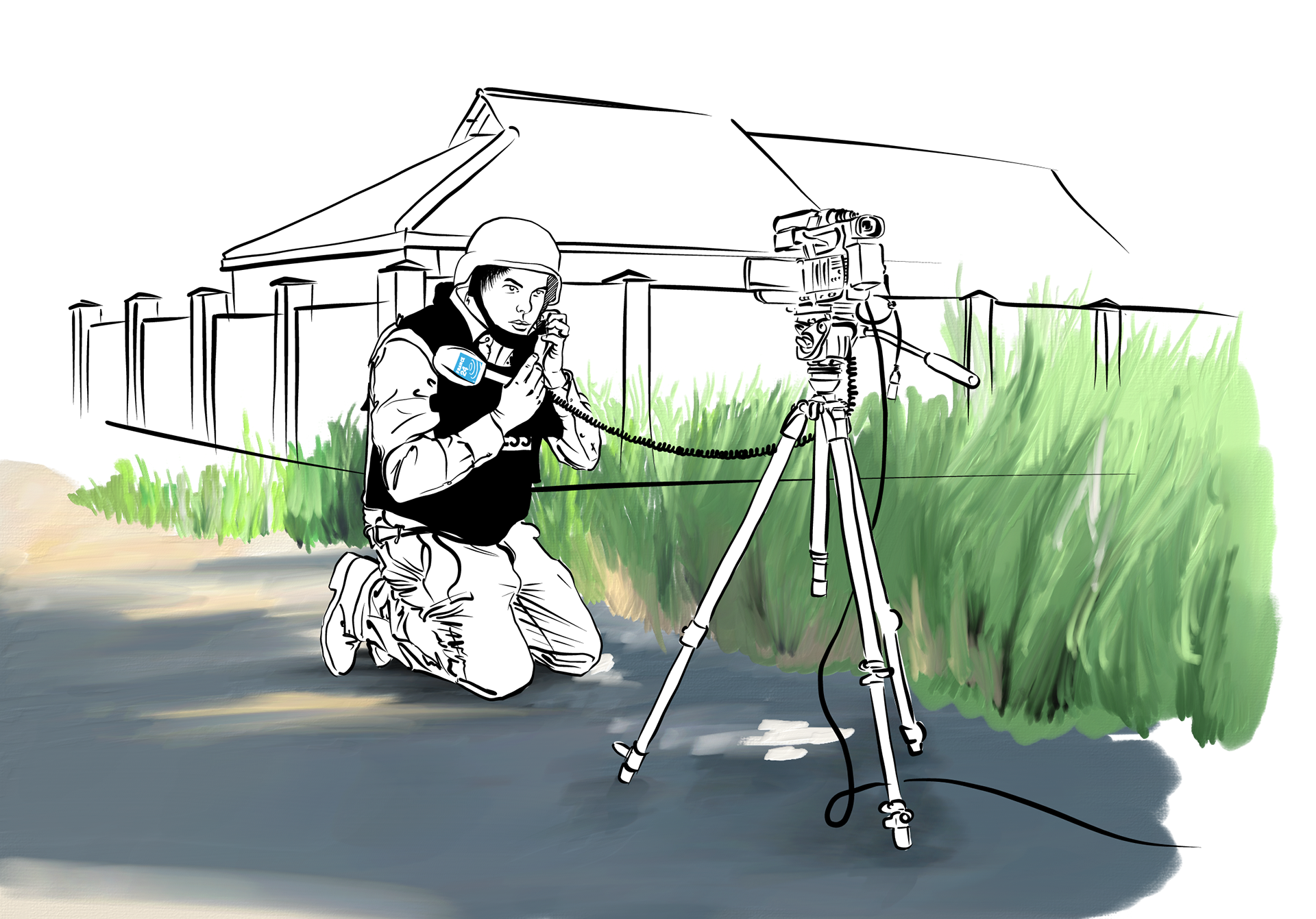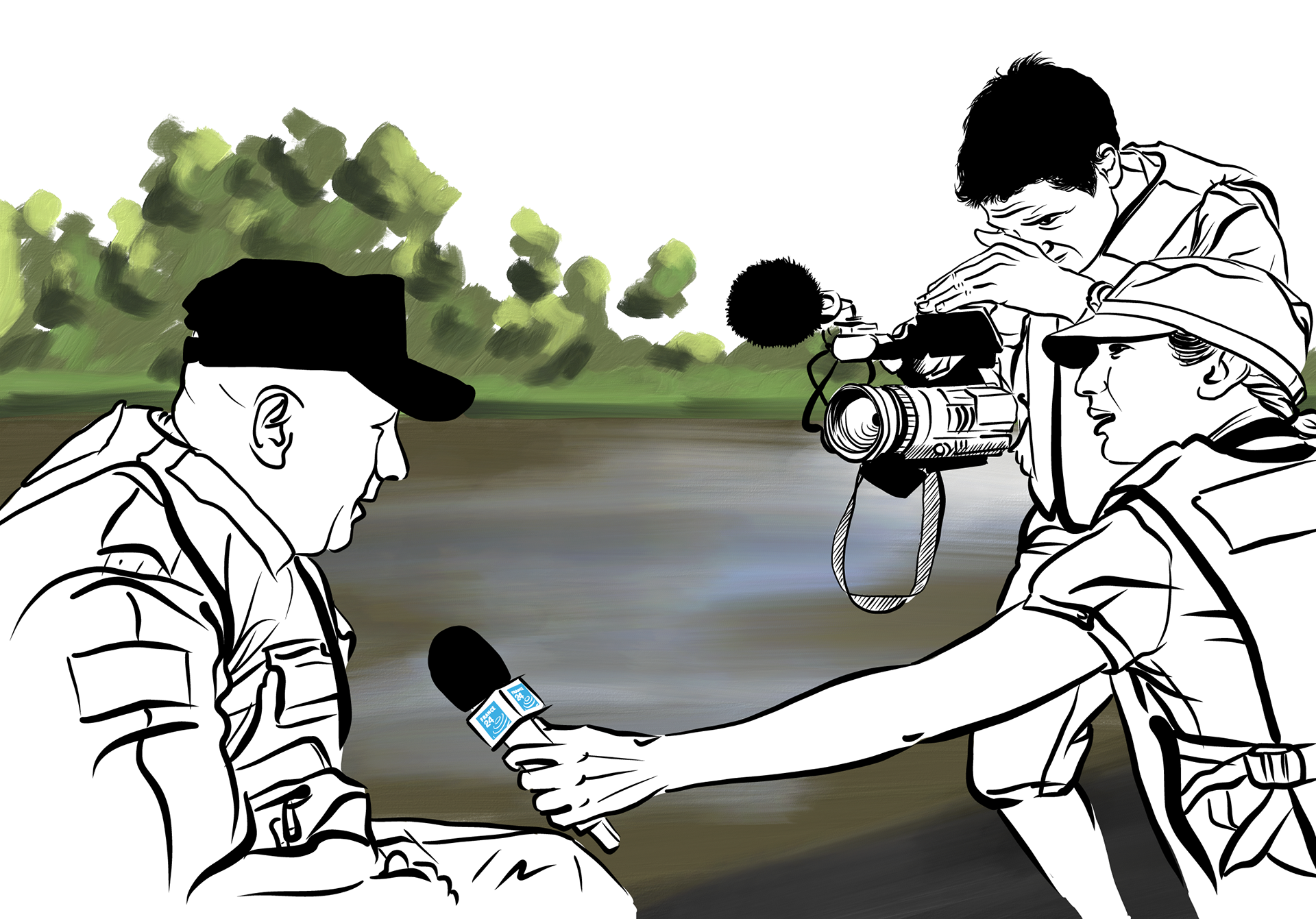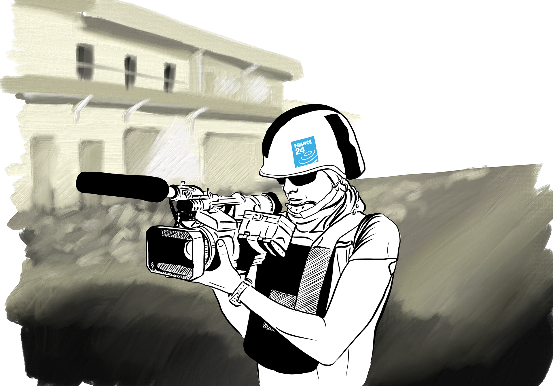 Illustrations thématiques autour du métier de journaliste, de terrain et de bureau.