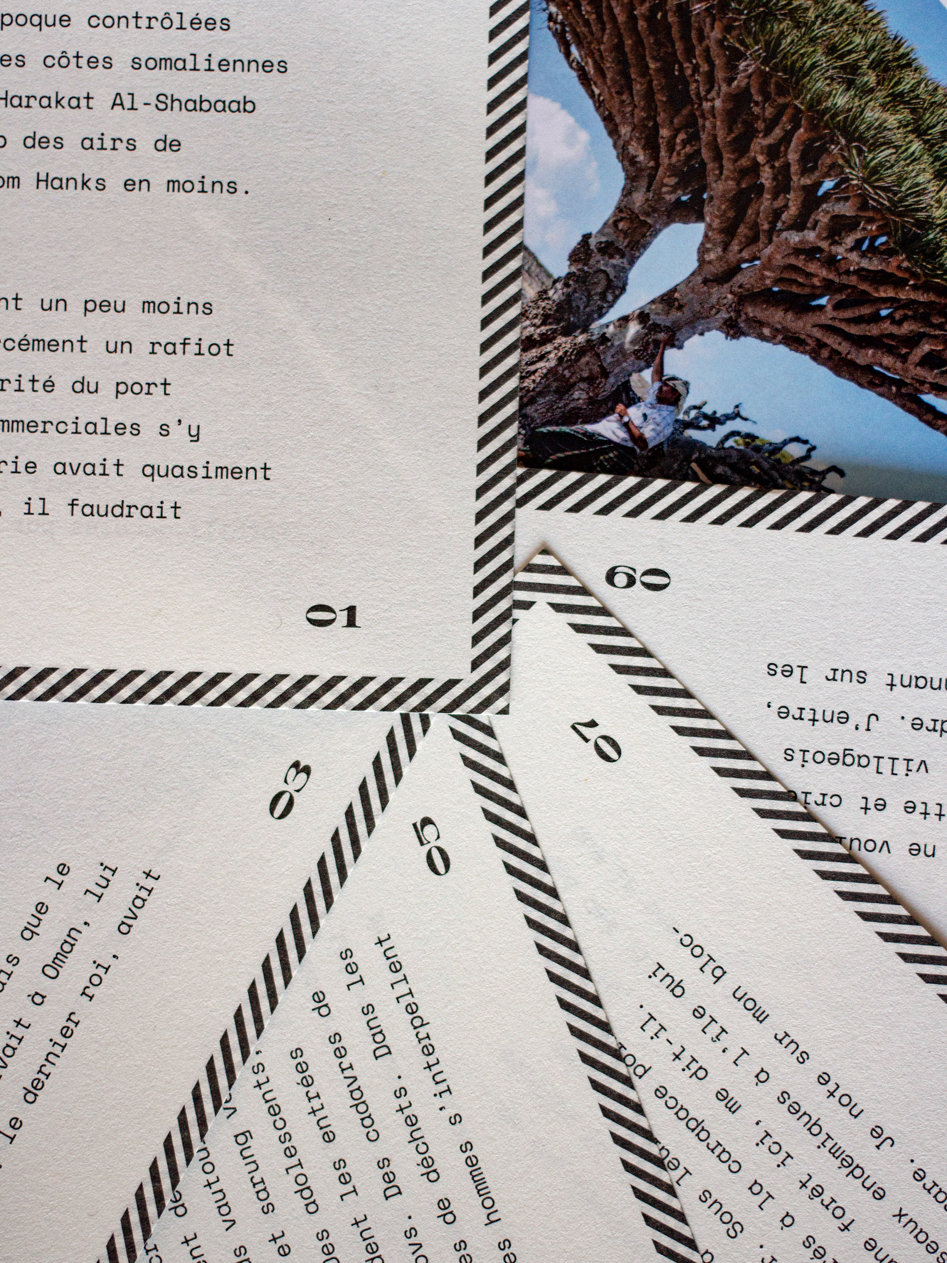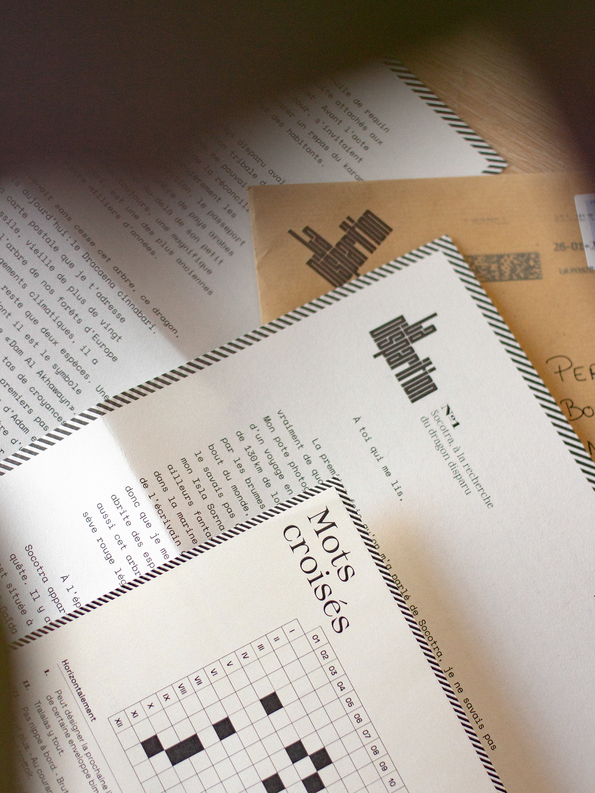J'ai conçu la direction artistique, le logo ainsi que les maquettes du site web comme de la lettre et ses extras. Les hachures, lignes discontinues, évoquent des parties inachevées ; notre envie principale était de rester très proches de la dactylographie, des tampons encreurs, du papier avion — en somme, garder un lien avec le passé tout en injectant de l'actuel par la typographie et la couleur.