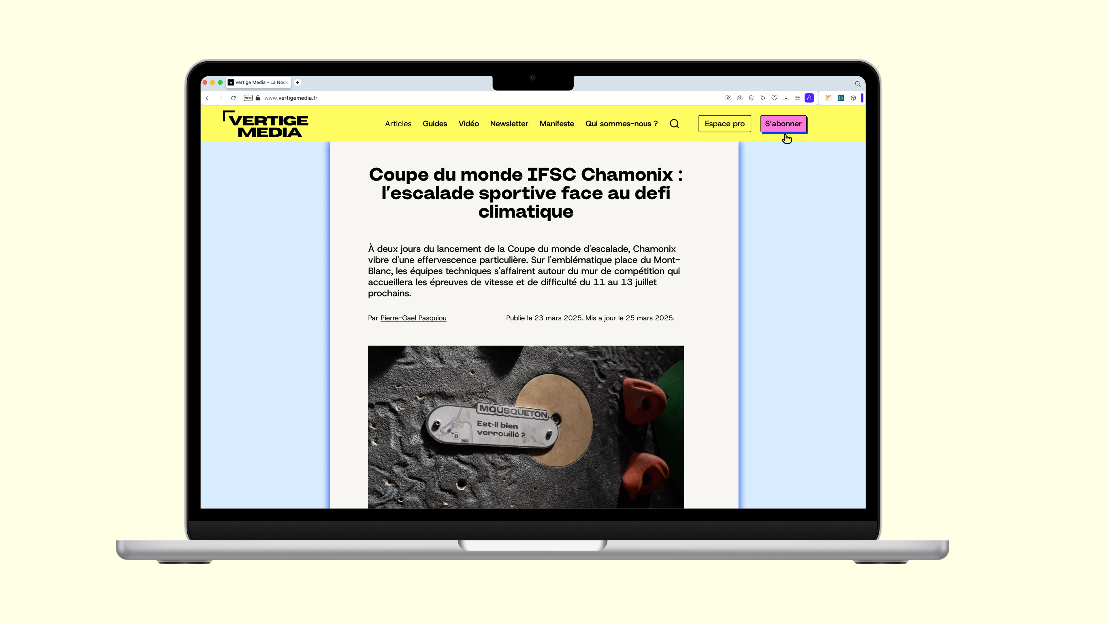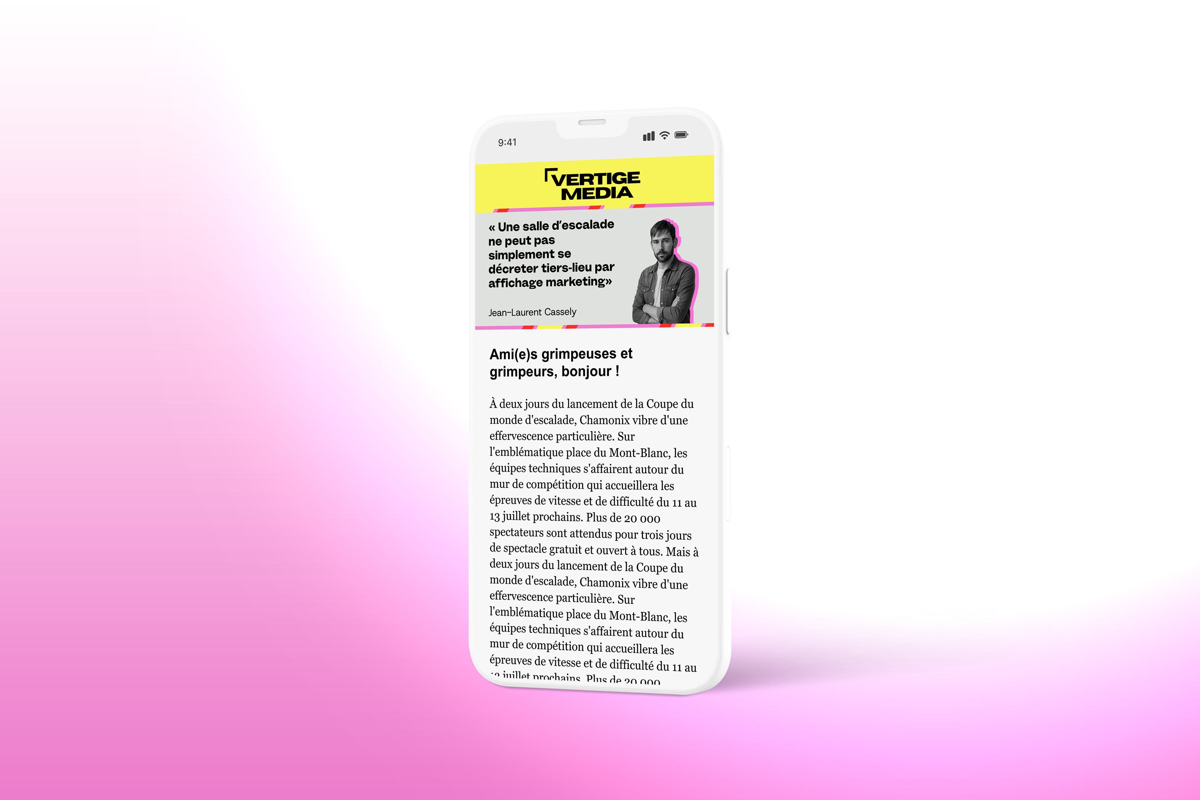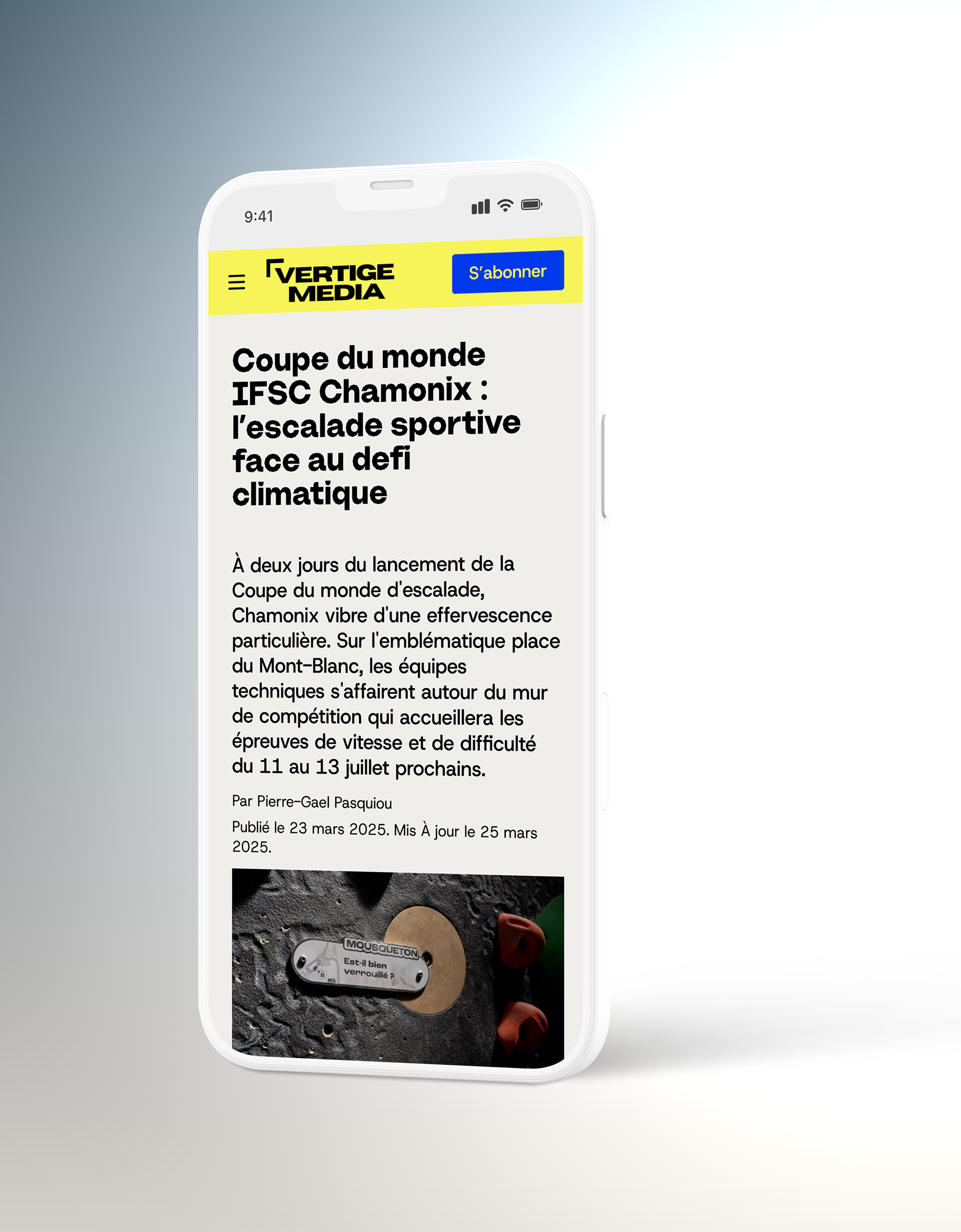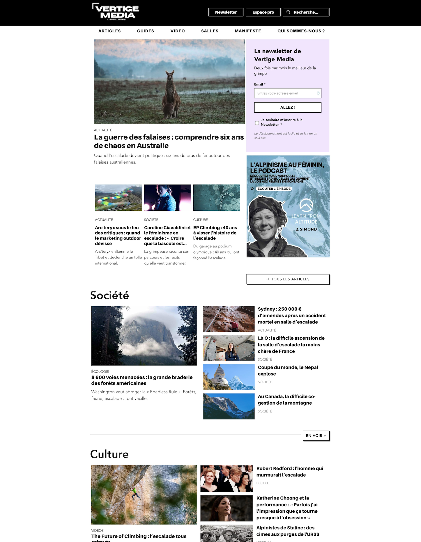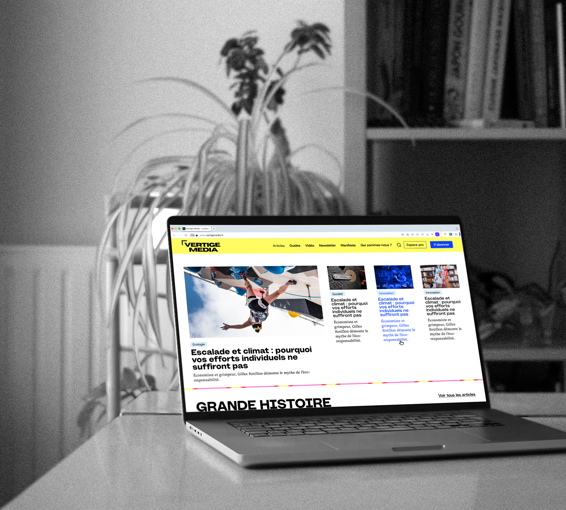 Vertige est un média sur l'escalade et les enjeux d'écologie et de féminismes propres à une pratique sportive en plein air. L'objectif de ce travail était de proposer de nouvelles couleurs, une nouvelle police pour améliorer le confort de lecture et fluidifier l'expérience utilisateur·ice sans trop perturber les habitudes.