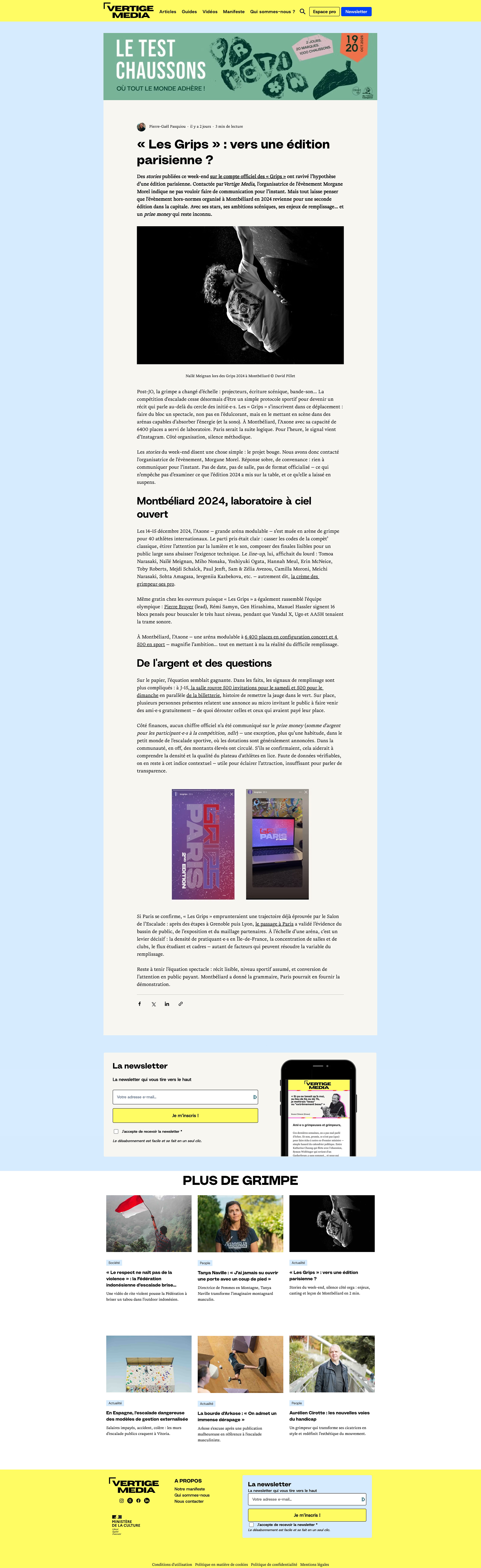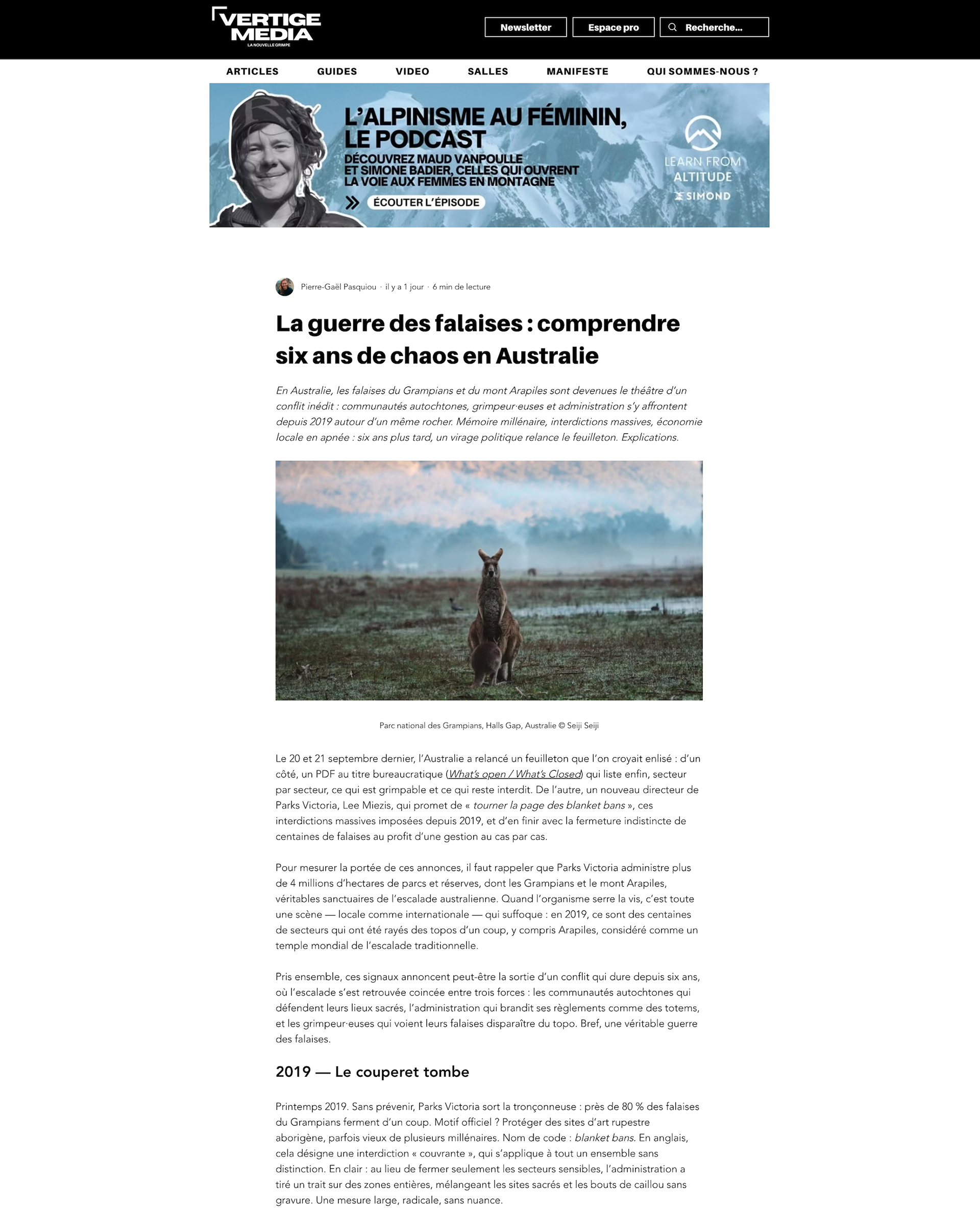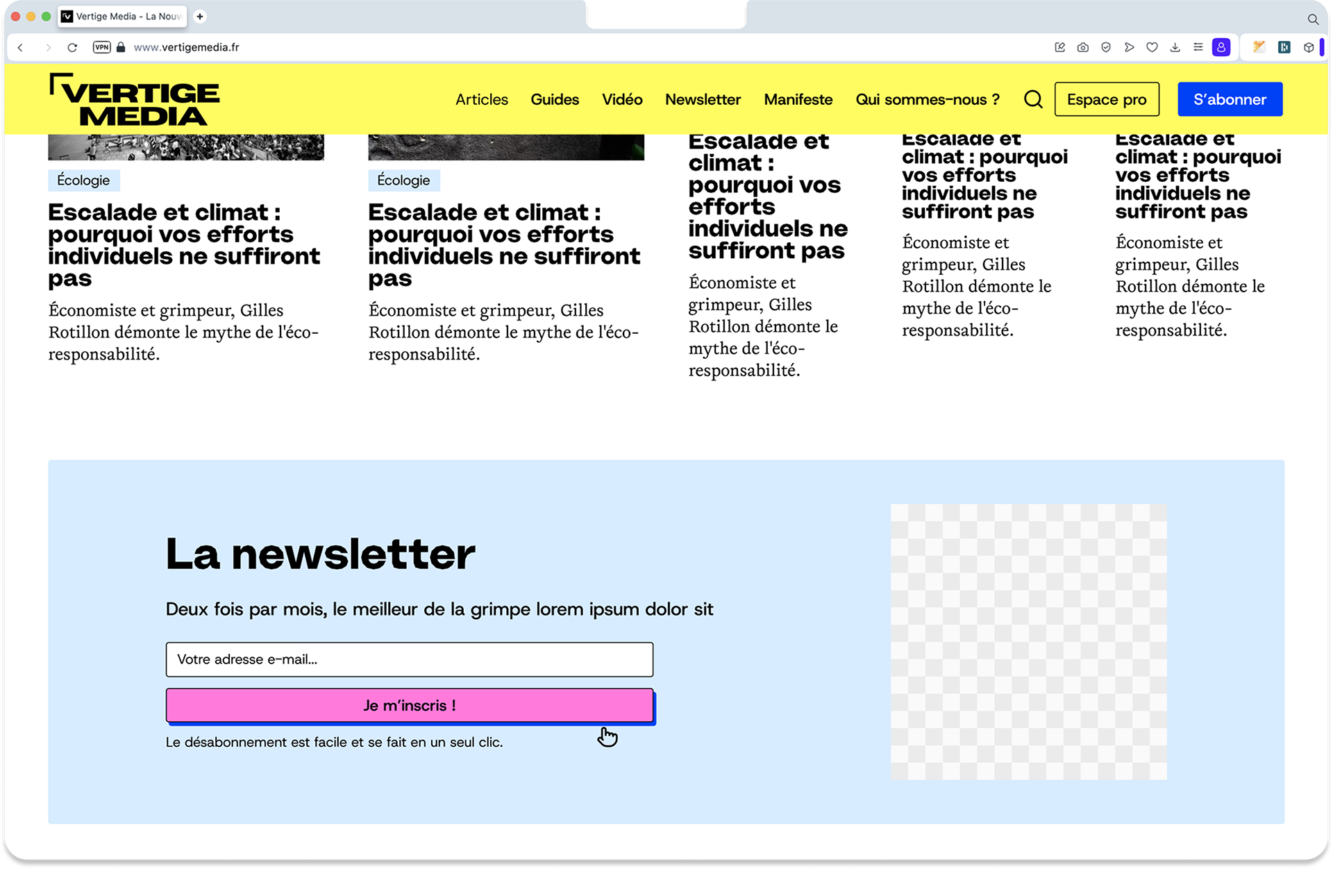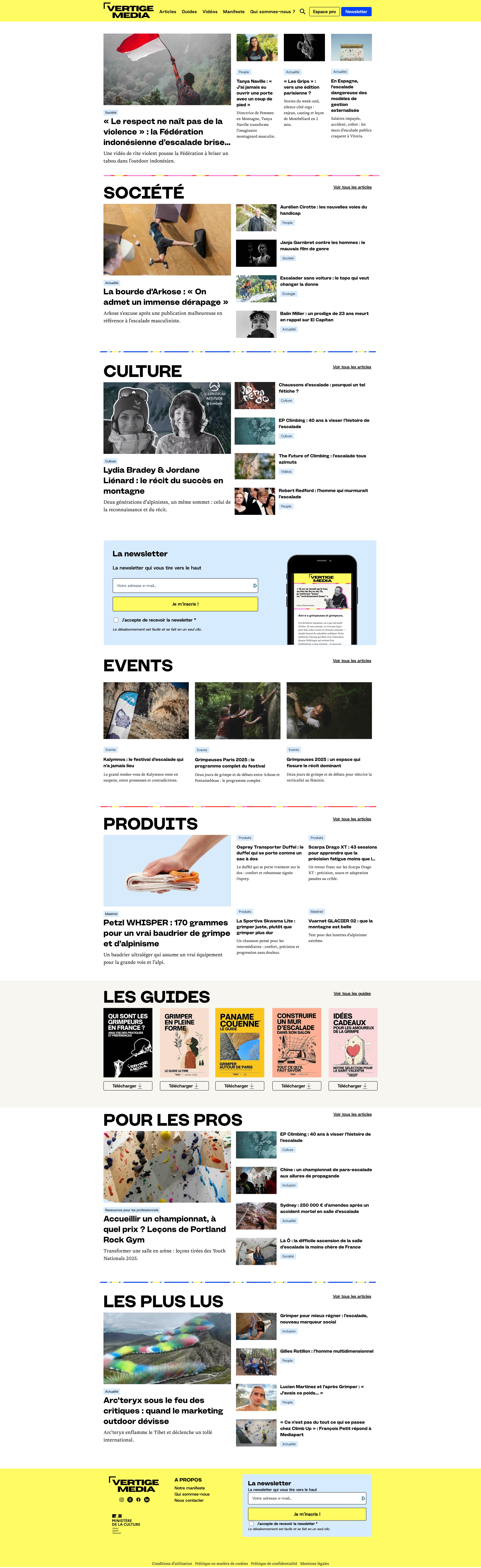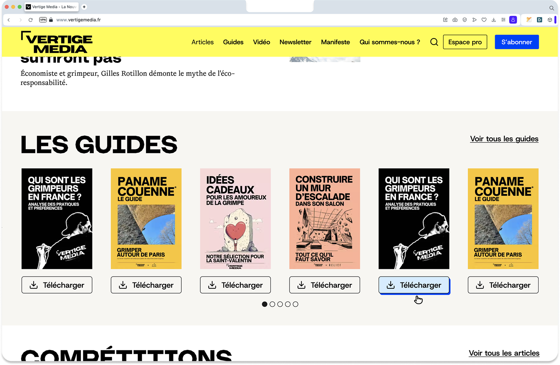 Vertige est un média sur l'escalade et les enjeux d'écologie et de féminismes propres à une pratique sportive en plein air. L'objectif de ce travail était de proposer de nouvelles couleurs, une nouvelle police pour améliorer le confort de lecture et fluidifier l'expérience utilisateur·ice sans trop perturber les habitudes.